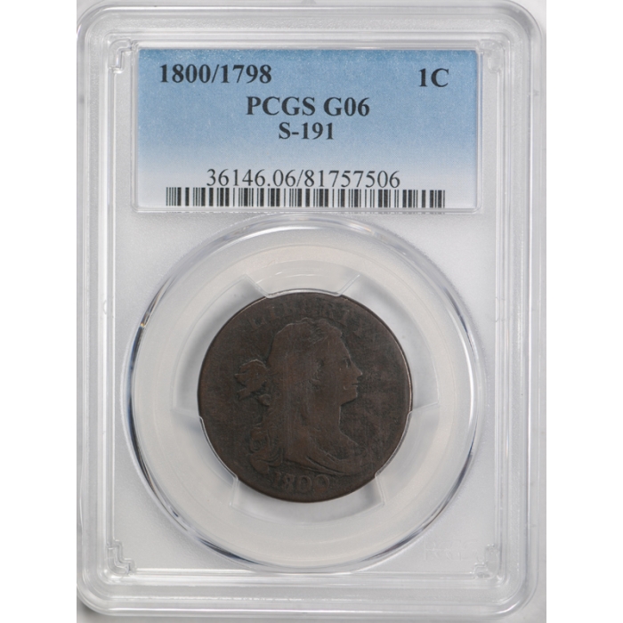 Description / 1800/1798 1C Sheldon 191 Draped Bust Cent PCGS G 6 Tough Variety