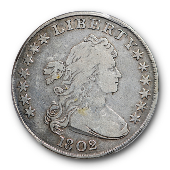 Description / 1802 $1 Draped Bust Dollar PCGS F 12 Fine Original Toned Early Silver American Coin