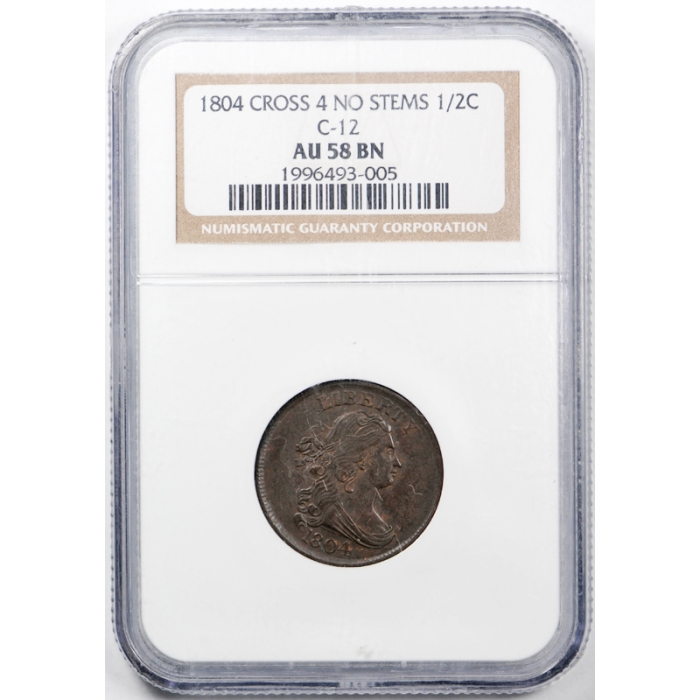 Description / 1804 Cross 4 No Stems Draped Bust Half Cent NGC AU 58 C-12 About Uncirculated