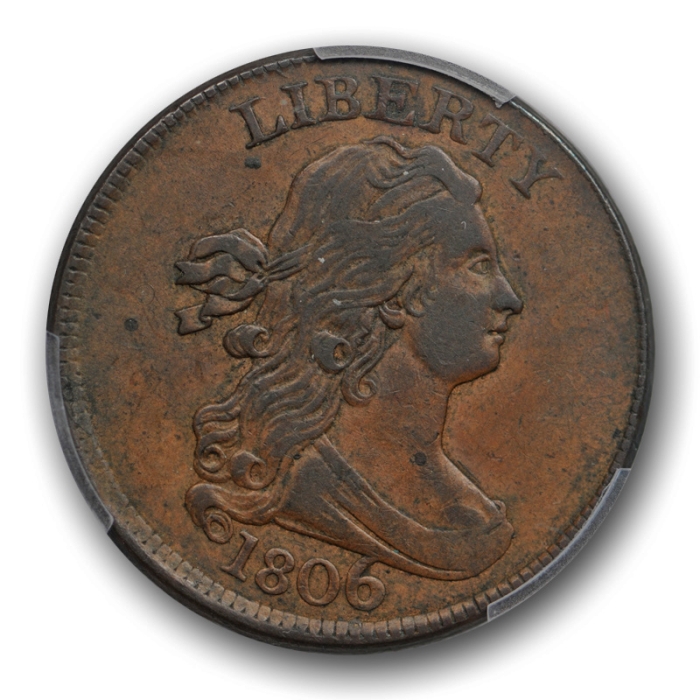 Description / 1806 1/2C Draped Bust Half Cent PCGS XF 45 Large 6, Stems US Type Coin Nice !