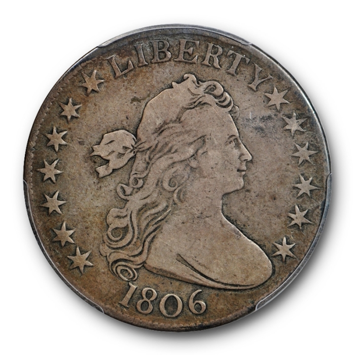 Description / 1806 50C Draped Bust Half Dollar PCGS F 12 Pointed 6, No Stem CAC Approved Looks Nicer!