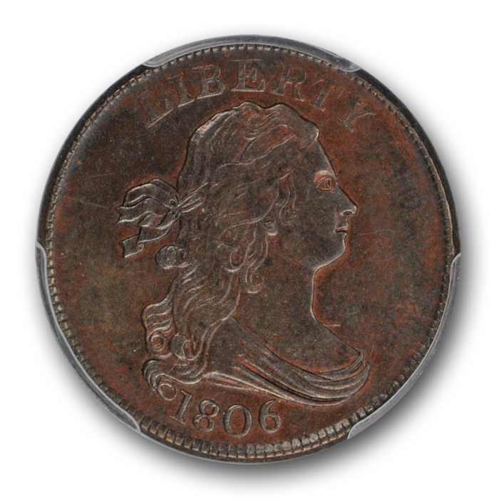 Description / 1806 Draped Bust Half Cent PCGS AU 53 BN 1/2C Small 6, No Stems About Uncirculated