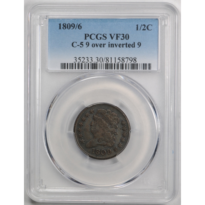 Description / 1809/6 1/2C 9 over inverted 9 Cohen 5 Classic Head Half Cent PCGS VF 30