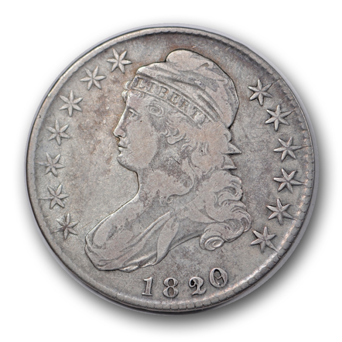 Description / 1820/19 50C Curl Base 2 Capped Bust Half Dollar Very Fine + R1056