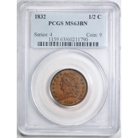 Description / 1832 1/2C Classic Head Half Cent PCGS MS 63 BN Uncirculated Brown Original !