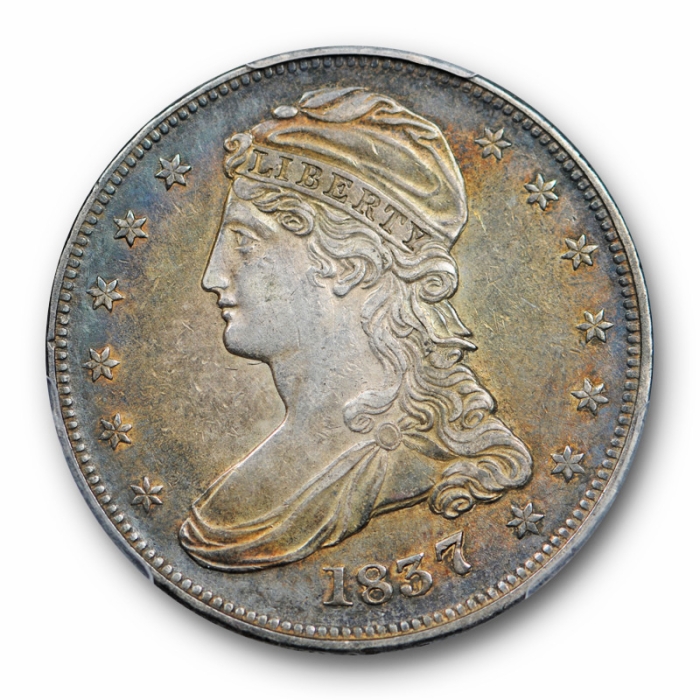 Description / 1837 50C Reeded Edge Capped Bust Half Dollar PCGS XF 45 Extra Fine to AU Toned