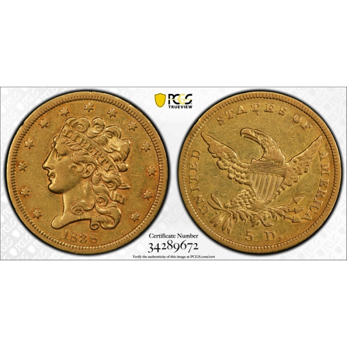 Description / 1838 $5 Classic Head Half Eagle PCGS XF 40 Extra Fine Gold US Type Coin Nice !