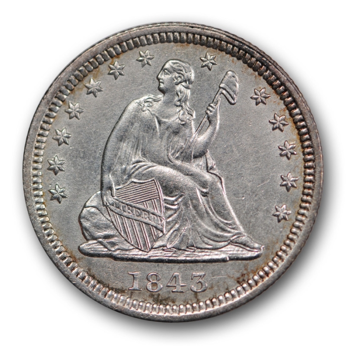 1843 25C Liberty Seated Quarter Uncirculated Mint State Cleaned R1628