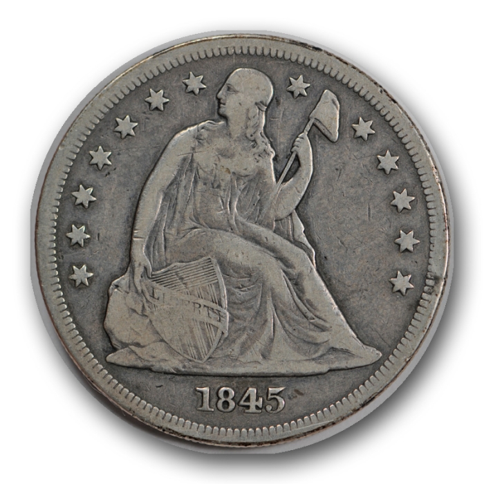 Description / 1845 $1 Liberty Seated Dollar Fine F Better Date R1291