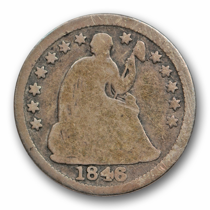 Description / 1846 H10C Seated Liberty Half Dime Good G Key Date Low Mintage Bent