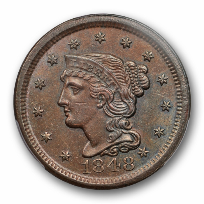 Description / 1848 1C Braided Hair Large Cent PCGS AU 58 About Uncirculated Cert#23423