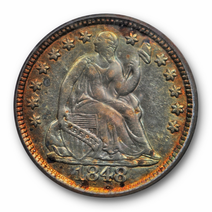 Description / 1848 H10C Medium Date Seated Liberty Half Dime PCGS AU 50 Toned Benson