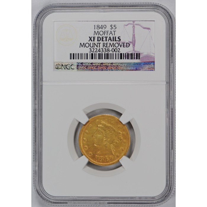 Description / 1849 Private Issue | Territorial Gold MOFFAT & CO. $5 NGC XF Details Extra Fine