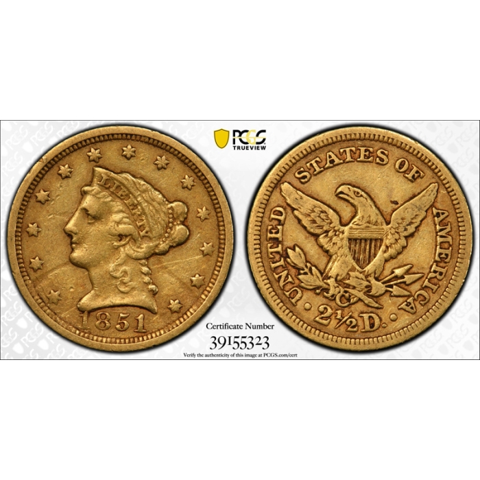 Description / 1851 C $2.50 Liberty Head Quarter Eagle Gold PCGS VF Very Fine Details Charlotte