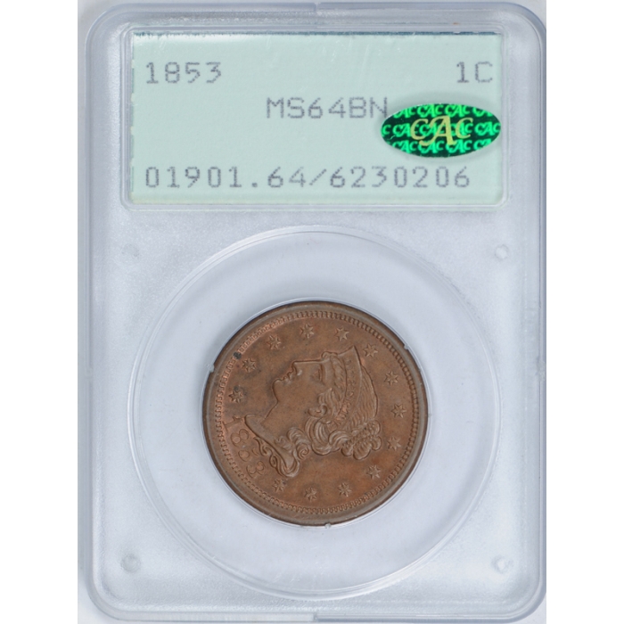 Description / 1853 Braided Hair Large Cent PCGS MS 64 BN Old Rattler Holder CAC Approved