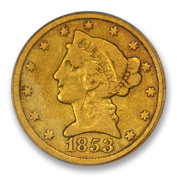 Description / 1853-C $5 Liberty Head Half Eagle PCGS VG-10 Charlotte Gold Very Good to Fine