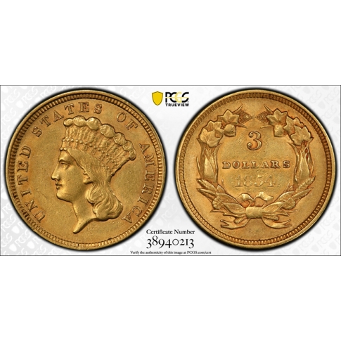 Description / 1854 $3 Three Dollar Gold Piece Princess Head PCGS AU 53 About Uncirculated