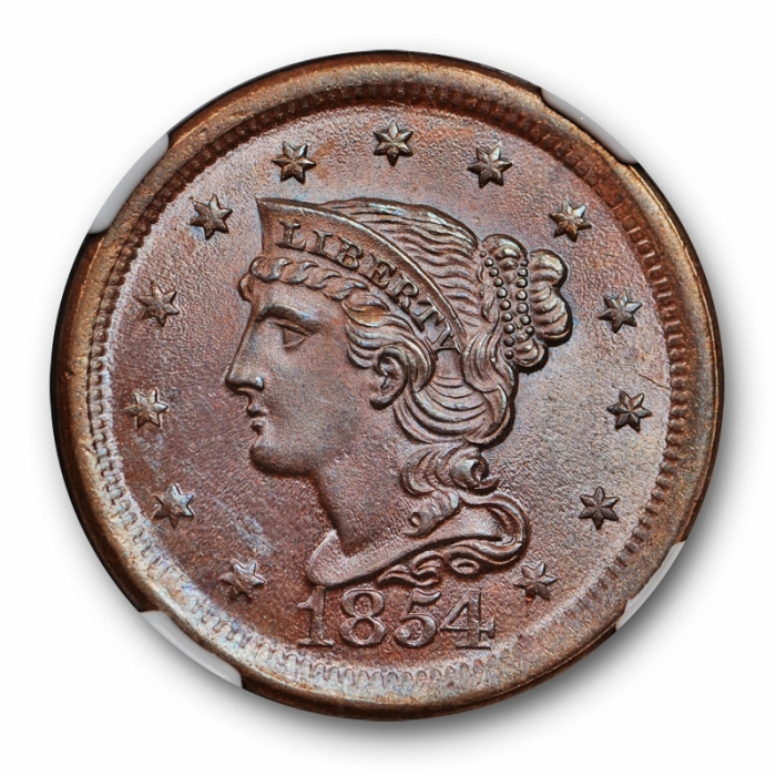 Description / 1854 Braided Hair Large Cent NGC MS 64 BN Pretty Toned Beauty Uncirculated