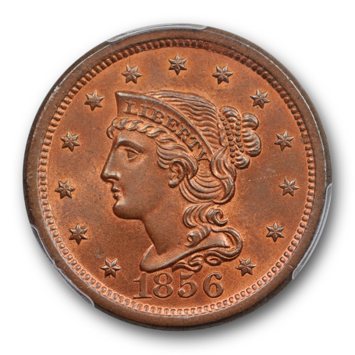 Description / 1856 1C Upright 5 Braided Hair Large Cent PCGS MS 65 RB Uncirculated Red Brown