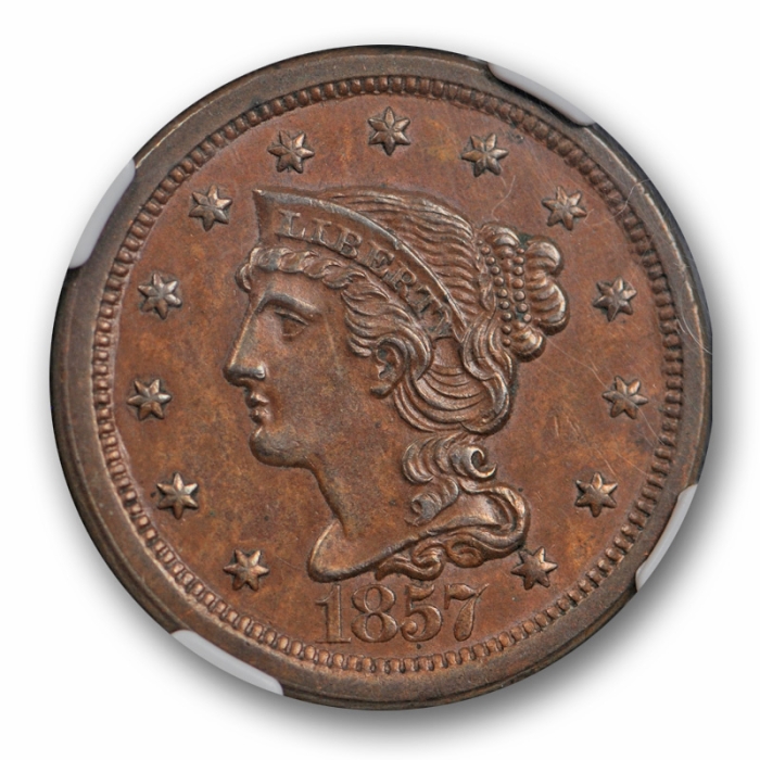 Description / 1857 Large Date Cent Braided Hair N-1 NGC AU 58 BN About Uncirculated