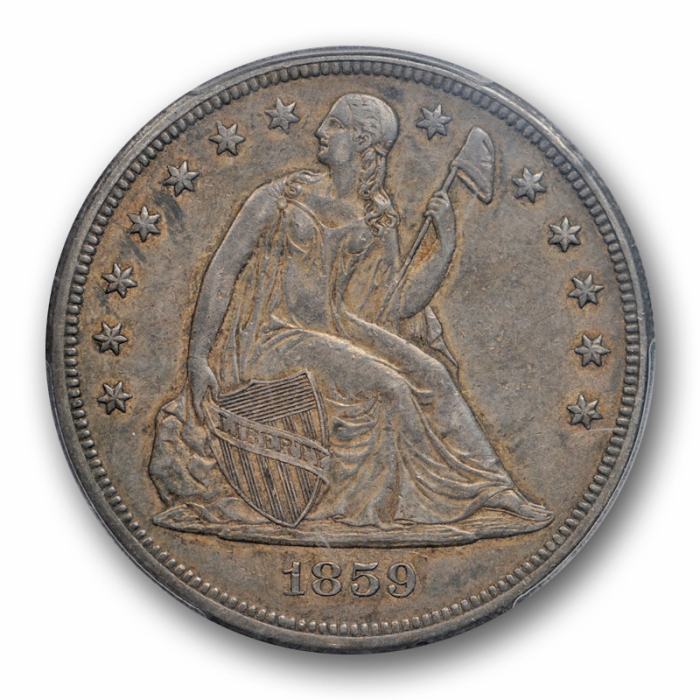 Description / 1859 O $1 Seated Liberty Dollar PCGS AU 50 About Uncirculated CAC Approved