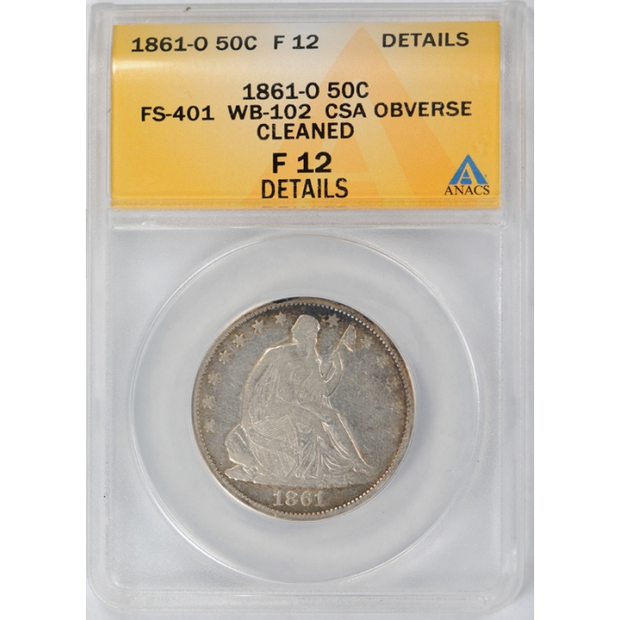 Description / 1861-O 50C CSA Obverse CSA Obv FS-401 Liberty Seated Half Dollar ANACS F 12 Details