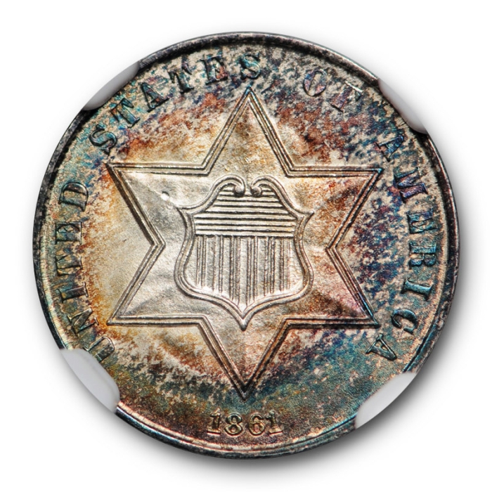 Description / 1861 Three Cent Silver Piece NGC MS 65 Uncirculated Beautiful Toned