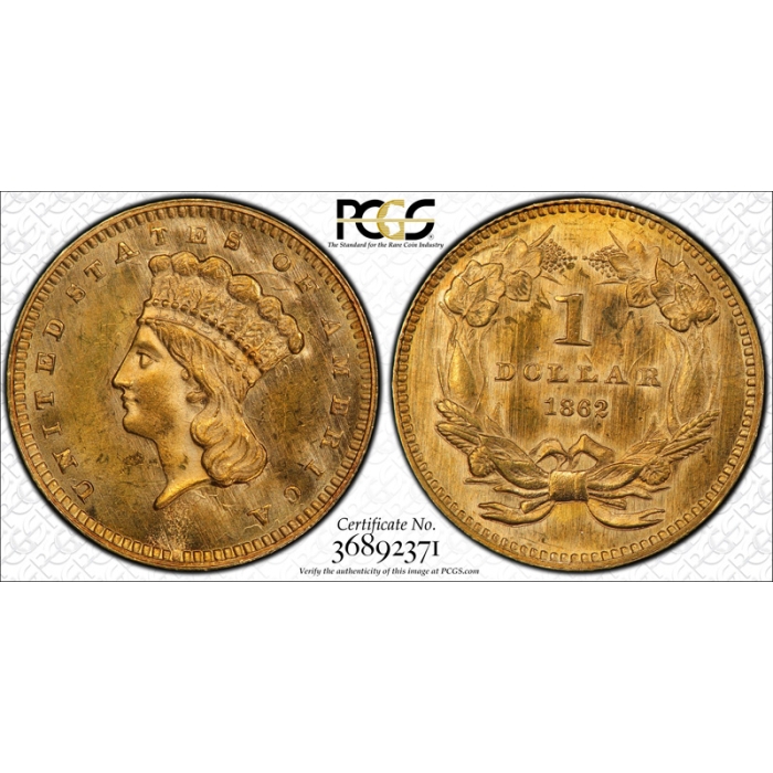 Description / 1862 G$1 Gold Dollar PCGS MS 64 Uncirculated Gold Princess Indian Head Nice !