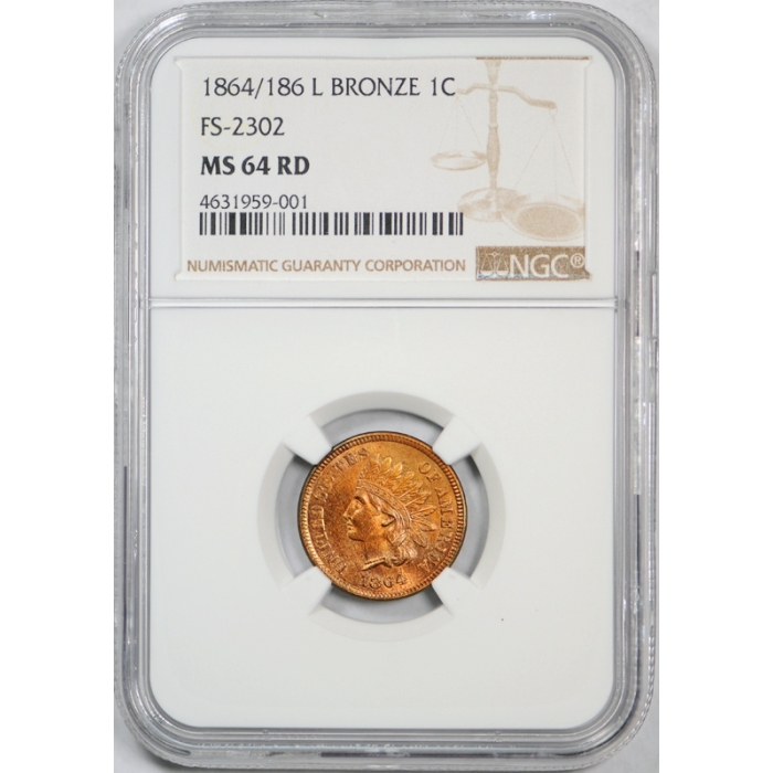 An absolutely beautiful 1864 L on ribbon Indian Head Cent graded MS 64 RD by NGC. It holds an excellent strike with very sharp detail for the grade level. It has a clear re-punched '186' on the obverse and has been designated as the FS-2302 variety which is also known as the S-3 variety. A very tough variety coin to find in this grade level that is seldom ever offered in this condition.