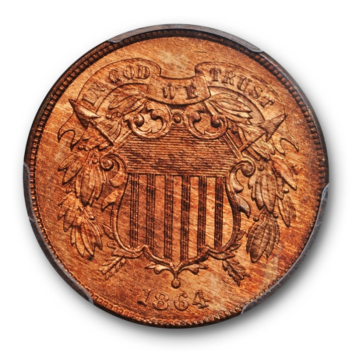 Description / 1864 2C Large Motto Two Cent Piece PCGS MS 64 RB Looks Full Red ! RD Beautiful Cert5958