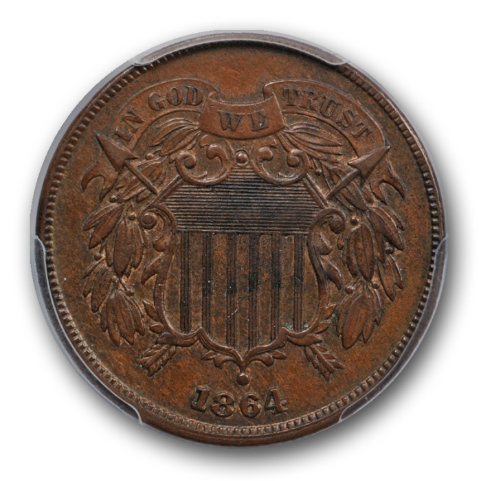 Description / 1864 2C Large Motto Two Cent Piece PCGS AU 58 BN Registry Coin