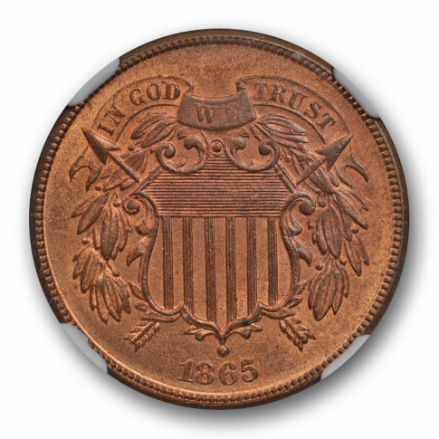 Description / 1865 2c Two Cent Piece NGC MS 65 RB Uncirculated Red Brown Fancy 5 US Type