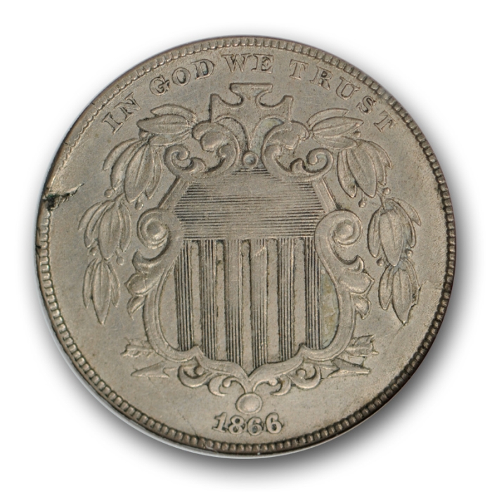 Description / 1866/1866 5C Rays RPD FS 301 Shield Nickel ANACS XF 40 Repunced Date !
