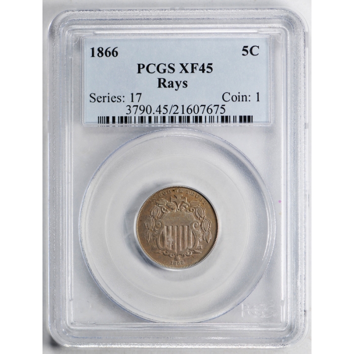 Description / 1866 5C With Rays Shield Nickel W/Rays PCGS XF 45 Extra Fine to AU Type Coin