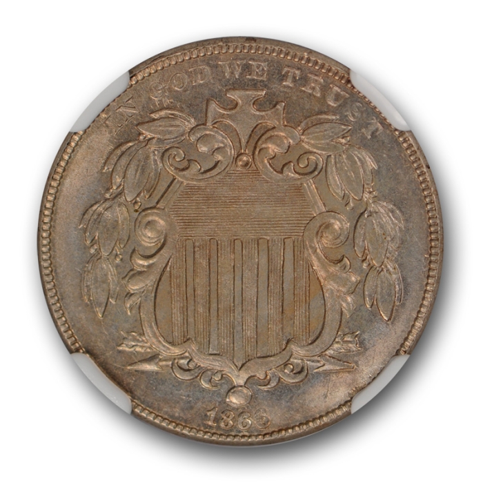 Description / 1866 With Rays Shield Nickel 5C NGC MS 64 Uncirculated Type Coin