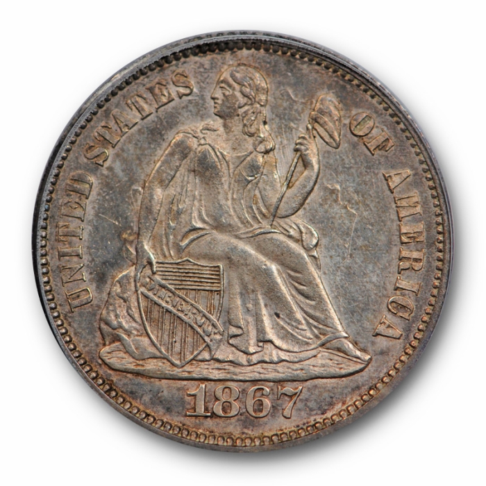 Description / 1867 10C Liberty Seated Dime PCGS PR 63 Proof Low Mintage Key Date Toned