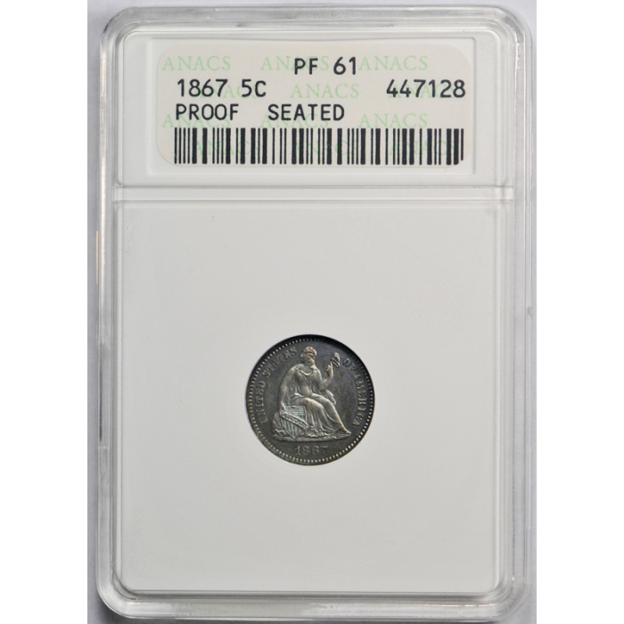 Description / 1867 H10C Seated Liberty Half Dime Proof ANACS PF 61 Pretty Toned