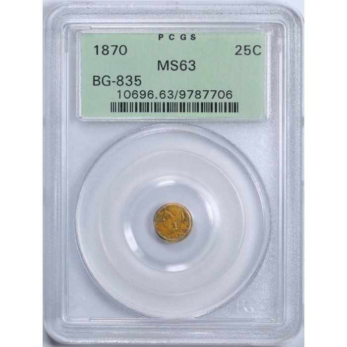 Description / 1870 25C BG 835 California Fractional Gold Quarter PCGS MS 63 Uncirculated OGH !