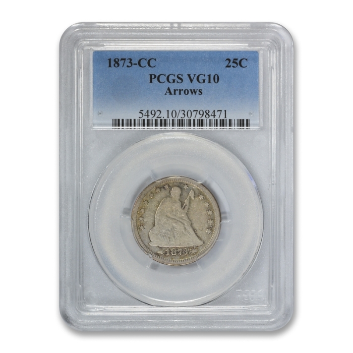 Description / 1873-CC 25C Liberty Seated Quarter PCGS VG 10 Carson City Key Date
