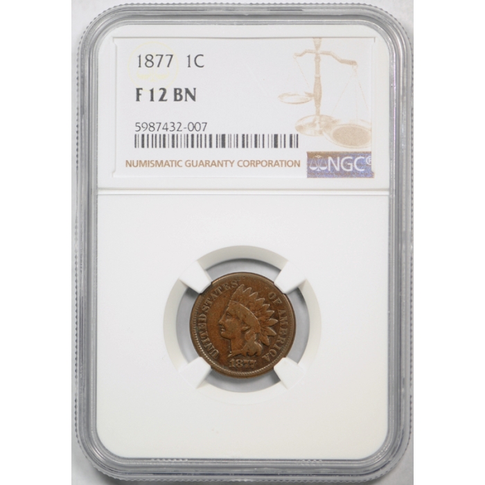 Description / 1877 1c Indian Head Cent NGC F 12 Fine Key Date US Coin Tough Grade !
