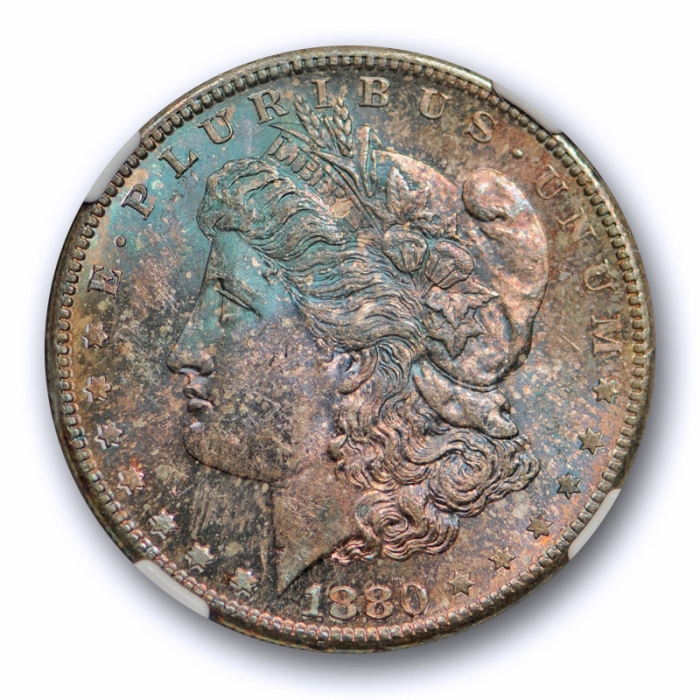Description / 1880 S $1 Morgan Dollar NGC MS 64 Uncirculated Blue & Purple Toned Unique