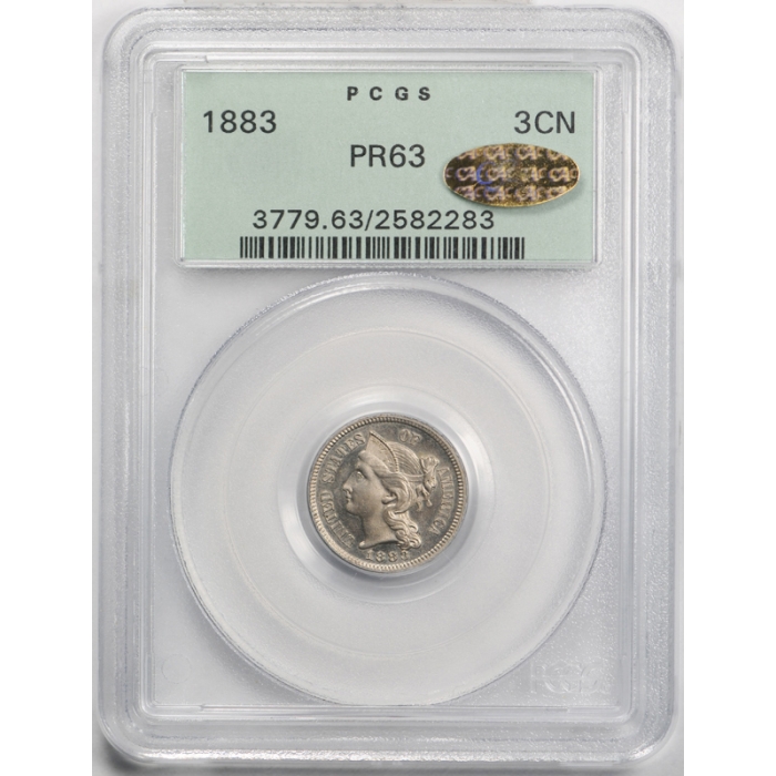 An absolutely beautiful 1883 key date proof Three Cent Nickel graded PR 63 by PCGS. This beautiful coin carries a great proof strike with very mark free surfaces. This coin is stored in an old green label holder (OGH) and looks much nicer than the deemed grade. It has earned the sought after 'Gold CAC Sticker' indicating they would even approve this coin for quality if it were at least a point graded higher.