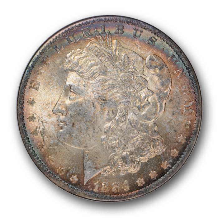 Description / 1884 O Toned Morgan Dollar ANACS MS 62 Colorful Rims Pretty Coin