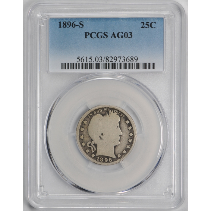 1896-S 25C Barber Quarter PCGS AG 3 About Good Key Date Coin