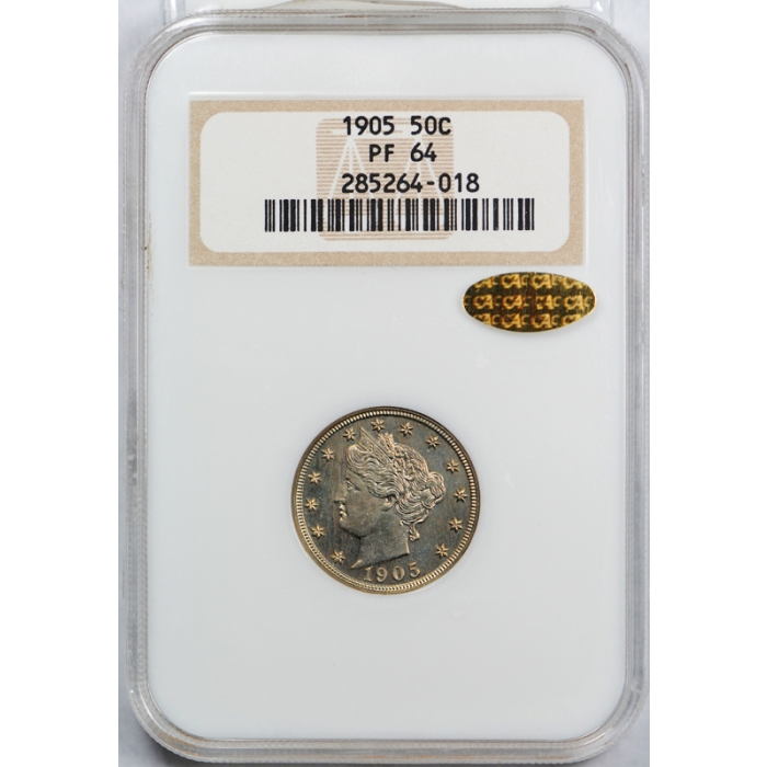 This coin is probably the most interesting liberty head nickel West Coast Coins has ever offered. This 1905 proof liberty head nickel has been graded PR 64 by NGC. It is stored in an NGC 'Old Fatty' holder, is significantly under-graded, the holder is in pristine condition, it is an NGC Error Label coin as it is listed as a proof barber half dollar, and it received the Gold CAC sticker from CAC.
