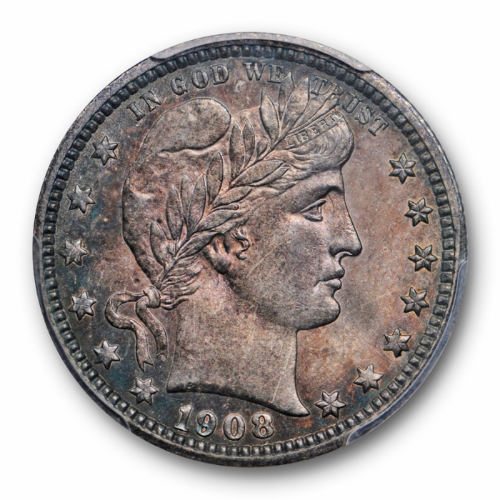Description / 1908 O Barber Quarter PCGS MS 63 Uncirculated New Orleans Dark Purple Toned