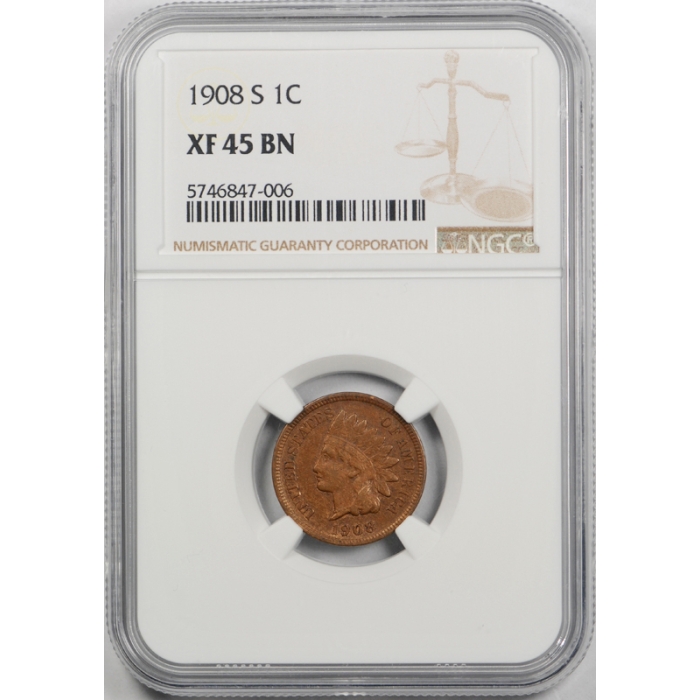 1908 S 1c Indian Head Cent NGC XF 45 Extra Fine to About Uncirculated Key Date Cert#7006