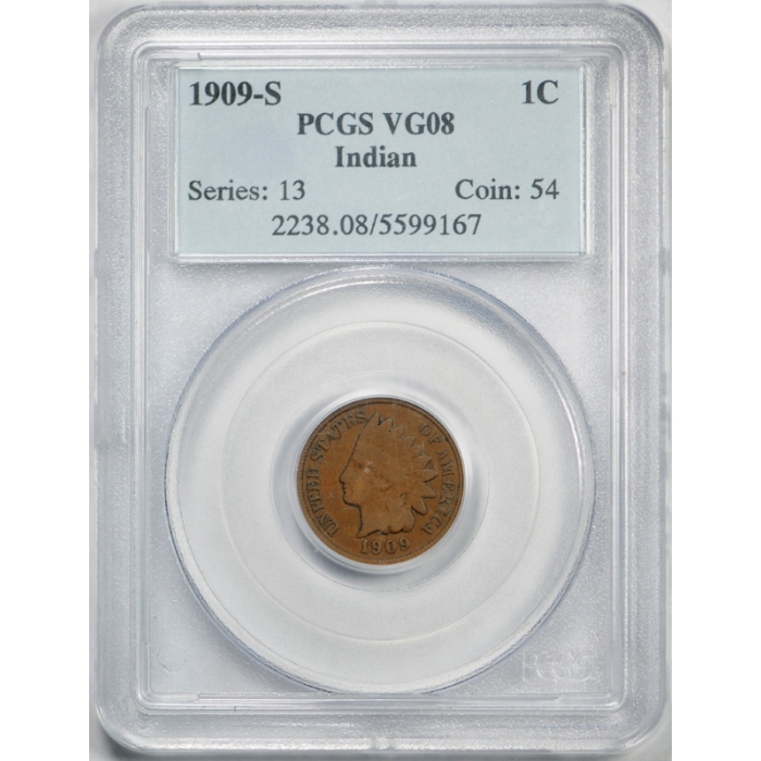 Description / 1909 S 1C Indian Head Cent PCGS VG 8 Very Good Key Date Low Mintage Tough !