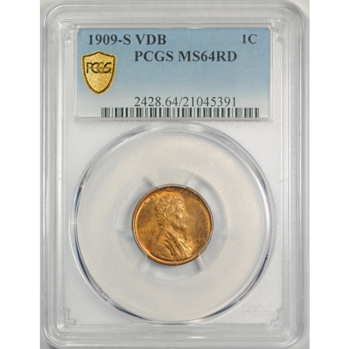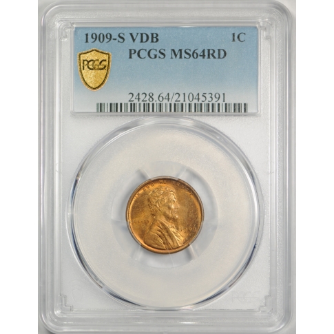 An absolutely beautiful 1909 S VDB key date Lincoln Wheat Cent graded MS 64 RD by PCGS. It carries a very sharp strike throughout both sides with stunning full red surfaces throughout both sides. It holds a strong date, clear S mint-mark, and bold VDB on the reverse. This key date coin is very seldom offered as a full red like this example. It has been housed in a PCGS Secure Label Holder. This key date coin has been in very strong demand among collectors and is by far our best selling coin.