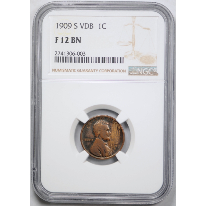 A very attractive 1909 S VDB key date Lincoln Wheat Cent graded F 12 by NGC. It carries excellent detail for the grade with a very unique 'woodgrain' style tone throughout both sides. It holds a very strong date, clear S Mint-mark and an easily readable V.D.B on the reverse. This key date has been by far our best seller and has continued to be in strong demand among collectors.